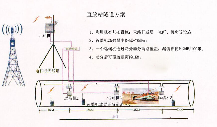 由于隧道內(nèi)信號(hào)衰減非常嚴(yán)重,并且隧道狹窄,不方便安裝定向天線,天線伴隨著列車駛過,安全行難以保障,因此,直放站+漏纜的覆蓋是最理想的可行的方案。充分利用現(xiàn)有的基礎(chǔ)條件,比如天線桿、機(jī)房、光纖等設(shè)施,在隧道內(nèi)安裝基站信號(hào)增強(qiáng)器遠(yuǎn)端機(jī),隧道上方拉泄露電纜的方式,遠(yuǎn)端機(jī)采用光纖分體式,便于覆蓋多個(gè)隧道群。